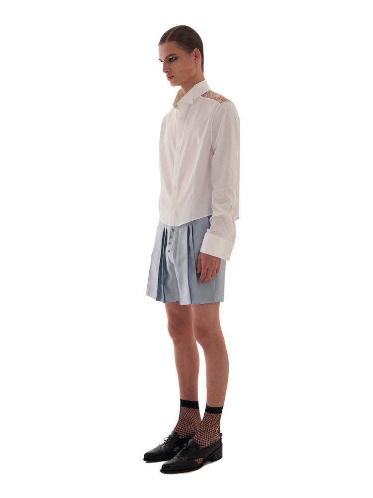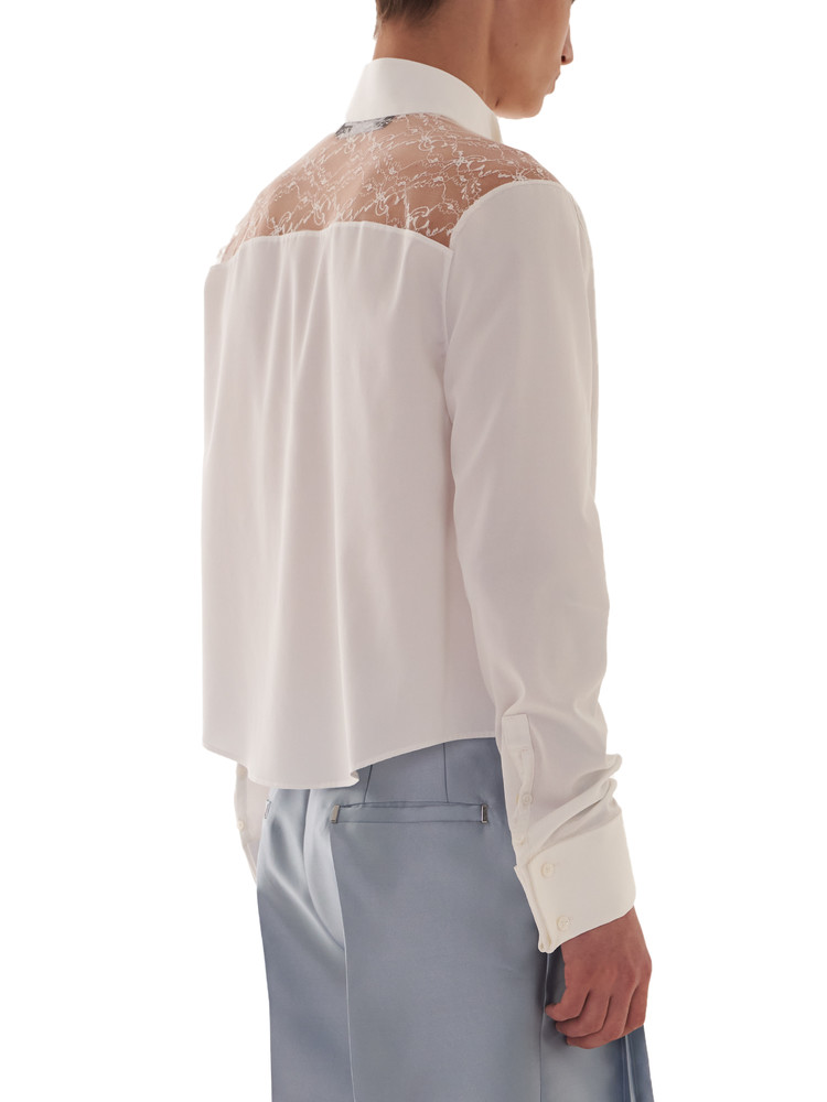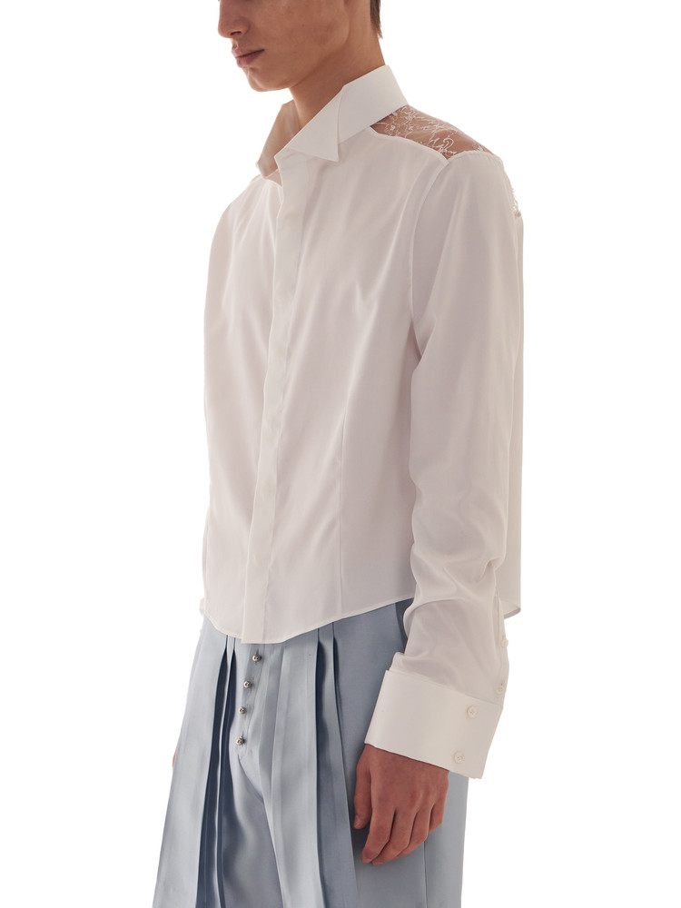 격식 있는 클래식 드레스 셔츠에 일본산 플로럴 레이스 요크 디테일이 더해져 우아하면서도 대조적인 매력을 선사합니다. 프렌치 커프가 고급스러움을 더해 클래식함과 현대적 감각을 동시에 표현합니다.