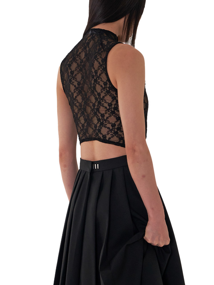 고급스러운 화이트 패브릭으로 된 플라스트론과 바디 실루엣을 은은하게 드러내는 플로럴 레이스가 로맨틱한 무드를 만들어냅니다. 세련되면서도 감성적인 디자인이 돋보이는 탑입니다.